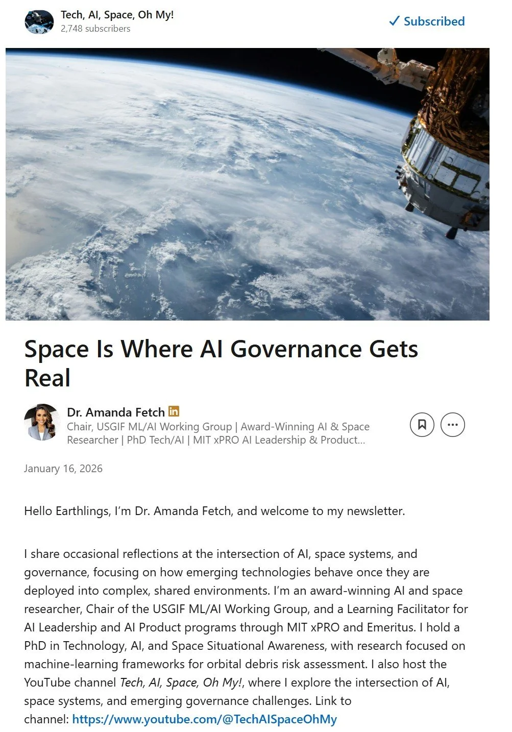 Latest News USGIF GEOINT Symposium 2026 – Aurora, Colorado | May 3–6, 2026Dr. Amanda Fetch will speak on AI-driven space situational awareness and orbital sustainability at the nation’s leading geospatial intelligence forum. Speaking Engagements 🎥 Tech, AI, Space, Oh My! (YouTube) Analysis